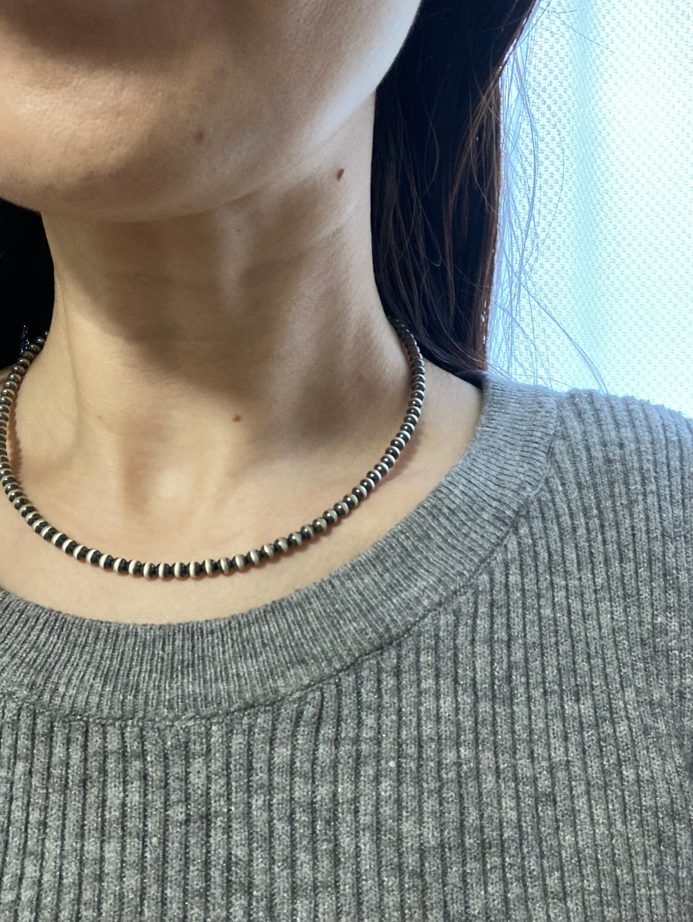 当店で人気の長さ・燻パール4mm×長さ40cmのナバホパールネックレスです。このネックレスは、シンプルさと上品さ兼ね備えたと重厚感のあるかっこよさを持つデザインが魅力です。燻しの輝きが、光によって見え方が変わるのもこの燻しの魅力。
